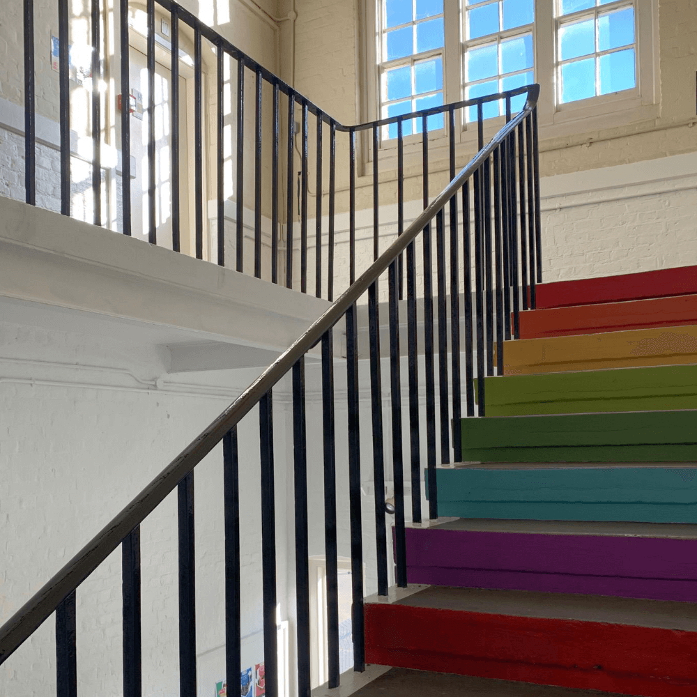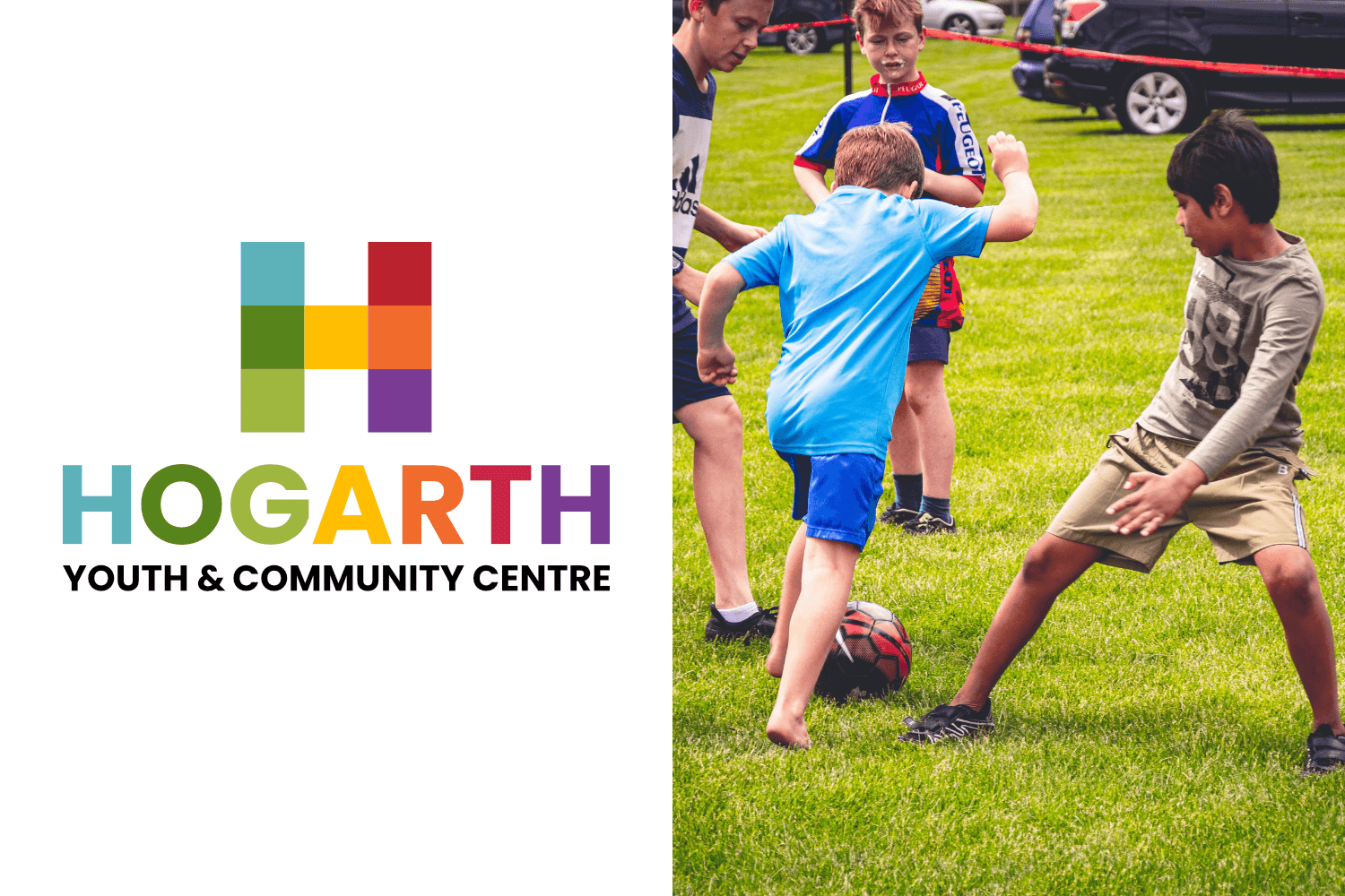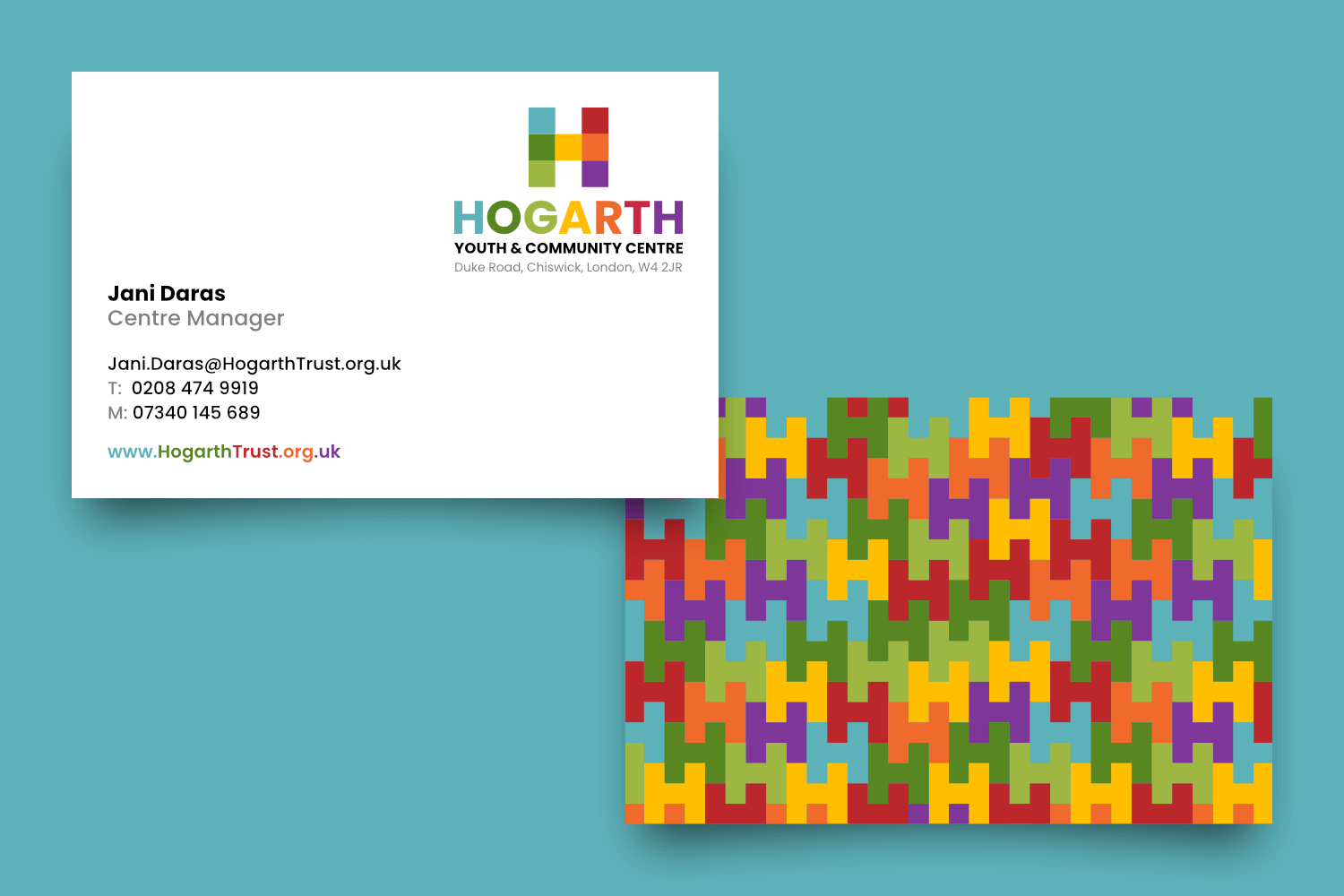 The Hogarth Youth & Community Centre. A Victorian School now used as a vibrant hub for the community in the heart of Chiswick is a charitable trust that required a brand update that would appeal to its wide range of visitors and new investors. The refreshed Hogarth solution references the original seven colours in a building block 'H', with scalable patterns and logos for all occasions, from one-colour merchandise to full-colour printing.